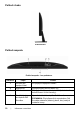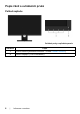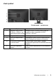 Pohled z boku Pravá strana Pohled zespodu Pohled zespodu - bez podstavce Označení 10 Popis Použití 1 Konektor pro napájecí kabel Pro připojení napájecího kabelu. 2 DisplayPort Připojte počítač pomocí kabelu DP. 3 VGA konektor Připojte počítač pomocí kabelu VGA (kabel obsažen, kromě Severní a Jižní Ameriky). 4 Montážní úchyty pro doplněk Dell Soundbar Upevnění volitelného doplňku Dell Soundbar.