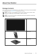 Contents About Your Monitor . . . . . . . . . . . . . . . . . . . . . . . . . . . . . . . . . . . . 5 Package Contents . . . . . . . . . . . . . . . . . . . . . . . . . . . . . . . . . . . . . . . . . . . . .5 Product Features . . . . . . . . . . . . . . . . . . . . . . . . . . . . . . . . . . . . . . . . . . . . . .7 Identifying Parts and Controls . . . . . . . . . . . . . . . . . . . . . . . . . . . . . . . . . .7 Monitor Specifications . . . . . . . . . . . . . . . . . . . . . . . . . . . . . . . . . . .