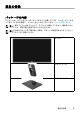 製品の特徴 パッケージの内容 モニターには、以下に示すコンポーネントがすべて付属しています。コンポーネントがす べて揃っているかを確認し、コンポーネントが足りないときは Dell へのお問い合わせ。 注:一部のアイテムはオプションで、モニターに付属していません。機能またはメ ディアには、特定の国で使用できないものもあります。 注:その他のスタンドをご購入頂いた際は、スタンドの設置方法はスタンドセット アップガイドをご参照ください。 モニター スタンドアーム スタンド ベース 製品の特徴 | 5
