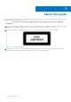 Notes, cautions, and warnings NOTE: A NOTE indicates important information that helps you make better use of your product. CAUTION: A CAUTION indicates either potential damage to hardware or loss of data and tells you how to avoid the problem. WARNING: A WARNING indicates a potential for property damage, personal injury, or death. © 2021 Dell Inc. or its subsidiaries. All rights reserved. Dell, EMC, and other trademarks are trademarks of Dell Inc. or its subsidiaries.