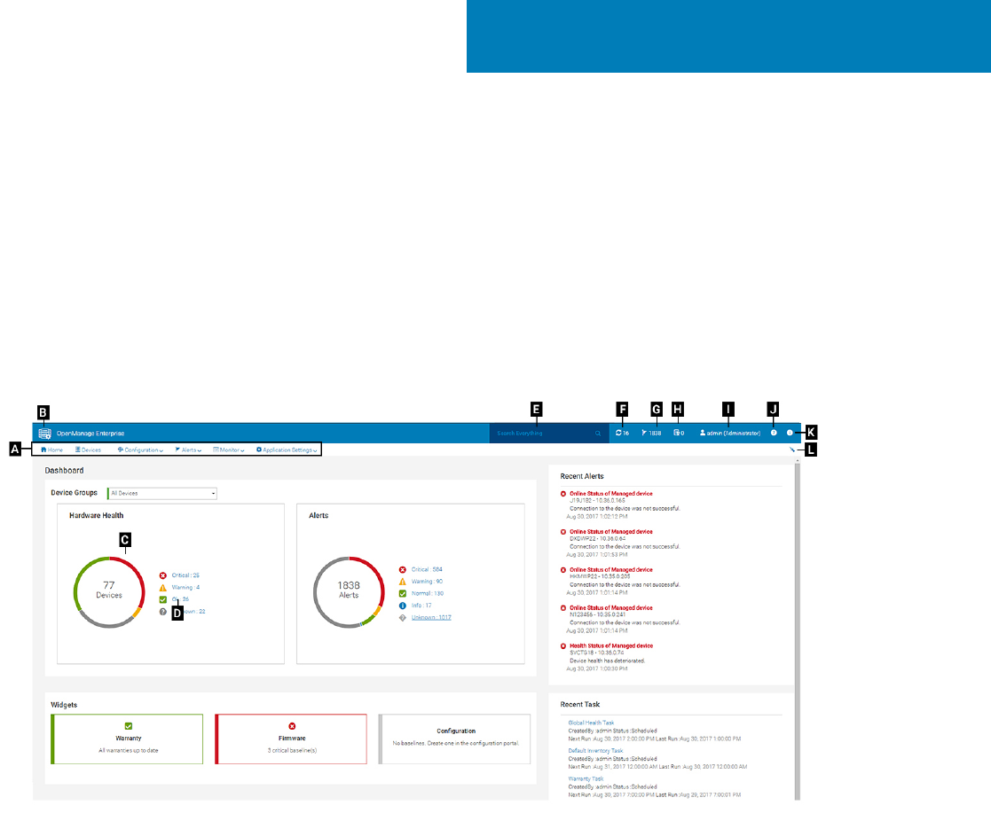 ● B – Das Dashboard-Symbol. Klicken Sie auf das Symbol, um die Dashboard-Seite von einer beliebigen Seite in OpenManage Enterprise
