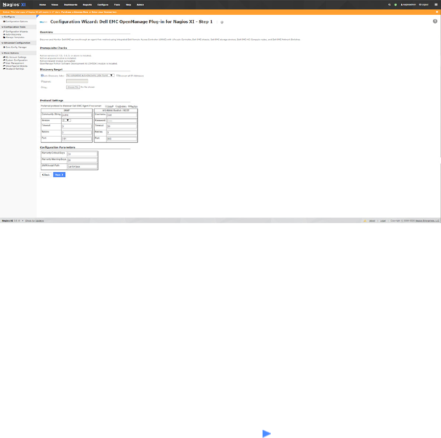 EMC OpenManage-Plugin für Nagios XI – Schritt 1 angegeben haben, klicken Sie auf die Schaltfläche Zurück.