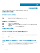 タスク 文書 場所 システムの設定 システムの設定、管理、アップデート、および復元の詳 細については、『Dell EMC Network Attached Storage System using Windows Storage Server 2016 Administrator's Guide』を参照してください。 www.dell.com/storagemanuals iDRAC 機能、iDRAC の設定と iDRAC へのログイン、お www.dell.com/idracmanuals よびシステムのリモート管理についての情報は、 『Integrated Dell Remote Access Controller User's Guide』(Integrated Dell Remote Access Controller ユーザーズガイド)を参照してください。 Remote Access Controller Admin(RACADM)サブ www.dell.