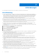 Hinweise, Vorsichtshinweise und Warnungen ANMERKUNG: Eine ANMERKUNG macht auf wichtige Informationen aufmerksam, mit denen Sie Ihr Produkt besser einsetzen können. VORSICHT: Ein VORSICHTSHINWEIS warnt vor möglichen Beschädigungen der Hardware oder vor Datenverlust und zeigt, wie diese vermieden werden können. WARNUNG: Mit WARNUNG wird auf eine potenziell gefährliche Situation hingewiesen, die zu Sachschäden, Verletzungen oder zum Tod führen kann. © 2012-2021 Dell Inc. All rights reserved.