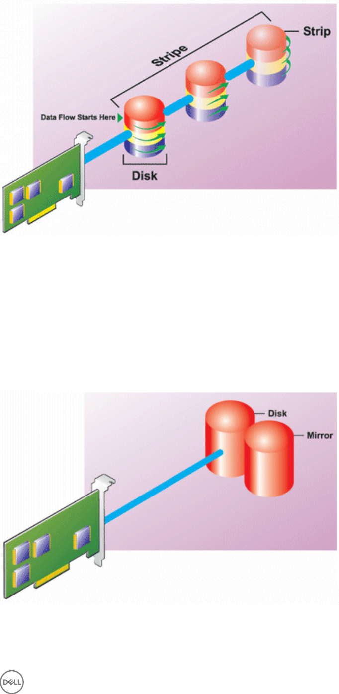 • Aucune donnée de redondance n'est conservée. Lorsqu'un disque échoue, le disque virtuel important échoue sans pouvoir