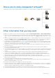 5 Social media reference To obtain the most up-to-date information, go to the Dell TechCenter and search for the required information. Table 4. Product Information Product Name and topic Link on Dell TechCenter Lifecycle Controller en.community.dell.com/techcenter/systems-management/w/wiki/ 1979.lifecycle-controller.aspx integrated Dell Remote Access Controller (iDRAC) en.community.dell.com/techcenter/systems-management/w/wiki/3204.dellremote-access-controller-drac-idrac.