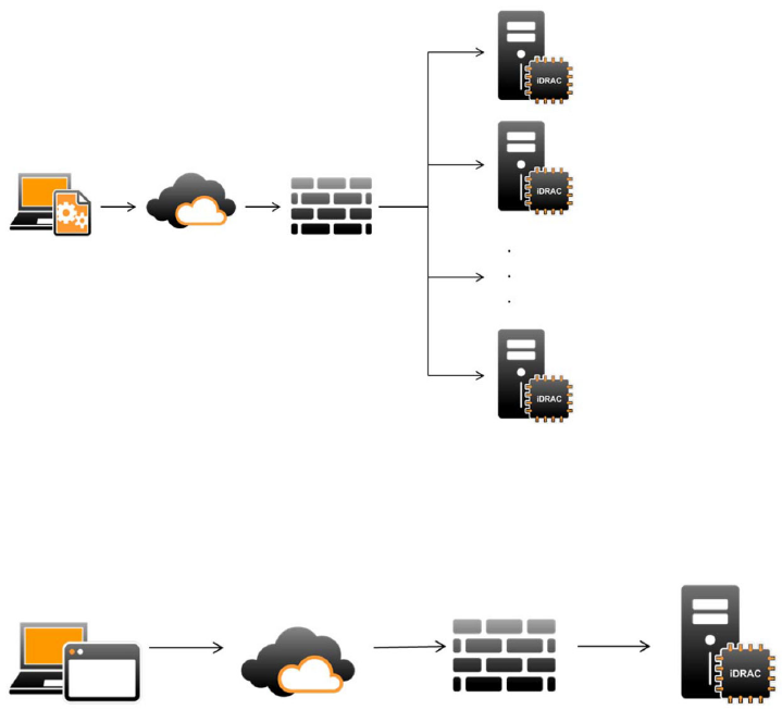 Un poste de gestion envoie l'API WS-MAN et iDRAC RESTful avec des commandes Redfish sur un réseau et ces commandes passent de