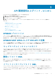 4 Lifecycle Controller API の統合 本項では、Lifecycle Controller API をアプリケーションに統合するために必要なリソースを説明します。 • • • • • API クライアント - WinRM または WSMAN への対応に使用できる API クライアントを紹介します。これらの API クライアント を使用すれば、さまざまなプログラミング言語でアプリケーションを作成できます。 ベストプラクティスガイド — 共通ワークフローについての情報を提供します。これには、すべての共通ワークフローのために すぐに使用できる Python スクリプトが提供されています。 サンプルスクリプトとツール — 追加の作業例および参照を提供します。 Lifecycle Controller-Remote Services を使用するアプリケーション — すでに Lifecycle Controller API と統合されている既存 アプリケーションをいくつかリストします。 WinRM および OpenWSMAN のインストールと設定 — WinRM および WSMAN を設定するため
