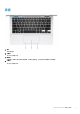攝影機 表 14. 攝影機規格 說明 值 攝影機數量 一個 類型 RGB HD 攝影機 位置 正面相機 感應器類型 CMOS 感應器技術 解析度: 靜態影像 92 萬像素 (HD) 影像 30 fps (1280 x 720 (HD)) 對角線檢視角度 78.6 度 觸控墊 表 15. 觸控墊規格 說明 值 解析度: 水平 3220 垂直 2422 水平 100 mm (3.94 in) 垂直 55 mm (2.17 in.) 尺寸: 觸控墊手勢 如需有關 Windows 10 觸控墊手勢的詳細資訊,請參閱 Microsoft 知識庫文章 4027871,網址為:support.microsoft.com。 電源變壓器 表 16. 電源變壓器規格 說明 值 類型 45 W 直徑 (連接器) 4.5mm 輸入電壓 100 VAC-240 VAC 輸入頻率 50 Hz-60 Hz 輸入電流 (最大值) 1.