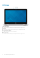 Affichage 1. Microphone gauche Fournit une entrée audio numérique pour l’enregistrement audio et les appels vocaux. 2. Webcam Permet de passer des appels vidéo, de prendre des photos et d’enregistrer des vidéos. 3. Voyant d’état de la webcam S’allume lorsque la webcam est en cours d’utilisation. 4. Microphone droit Fournit une entrée audio numérique pour l’enregistrement audio et les appels vocaux.