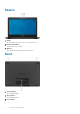2 Visninger af Inspiron 3493 Højre 1. SD-kortslot Læser fra og skriver til SD-kort 2. USB 2.0-port Tilslut perifert udstyr som eksterne lagerenheder og printere. Giver dataoverførselshastigheder op til 480 Mbps. 3. Sikkerhedskabelslot (kileformet) Tilslut et sikkerhedskabel for at forhindre, at computeren flyttes uautoriseret. Venstre 1. Strømadapterport Tilslut en strømadapter for at strømforsyne computeren. 2.