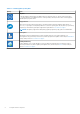 Tabela 7. Gniazda wewnętrzne Opis Wartości PCIe Jedno gniazdo o pełnej wysokości PCIe trzeciej generacji x16 i jedno złącze o pełnej wysokości PCIe trzeciej generacji x1 SATA Jedno gniazdo SATA 2.0 na płaski napęd optyczny i dwa gniazda SATA 3.0 na dysk twardy 3,5"/2,5" M.2 ● Jedno gniazdo M.2 2230 na kartę Wi-Fi/Bluetooth ● Jedno gniazdo M.2 2230/2280 na dysk SSD UWAGA: Aby dowiedzieć się więcej na temat cech różnych typów kart M.