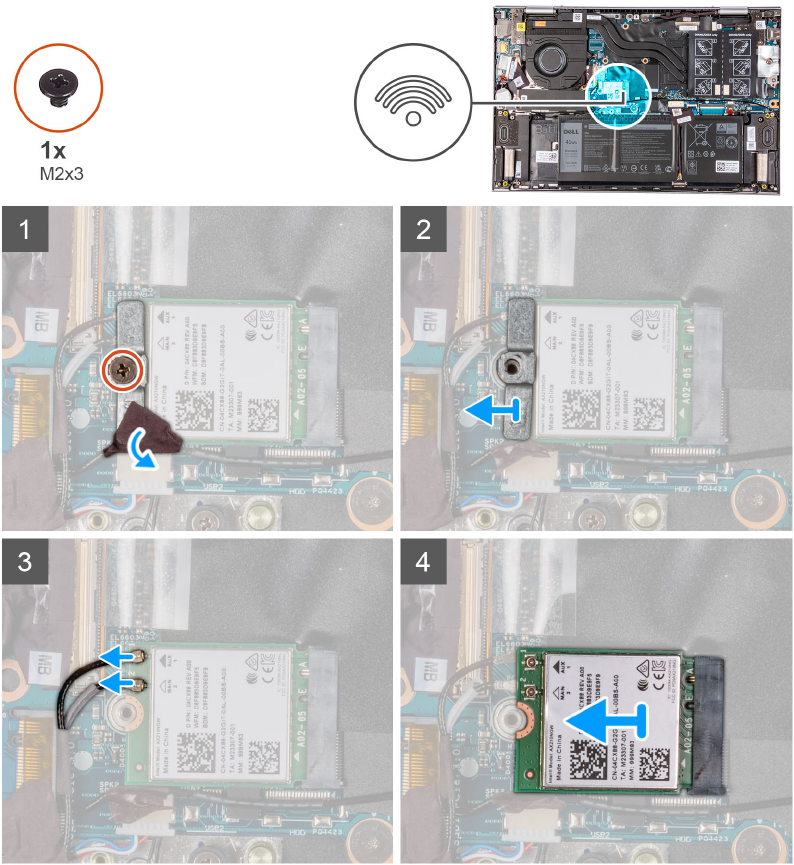 2. Remove the screw (M2x3) that secures the wireless-card bracket to the wireless card and system board.