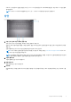 디바이스 간 양방향으로 전원을 공급할 수 있는 Power Delivery를 지원합니다. 더욱 빠르게 충전할 수 있는 최대 5V/3A 전원 출력 을 제공합니다. 노트: DisplayPort 디바이스에 연결하려면 USB Type-C~DisplayPort 어댑터(별도 판매)가 필요합니다. 상단 1. 지문 인식기(선택 사항)가 장착된 전원 버튼 꺼져 있거나, 대기 또는 최대 절전 모드에서 누르면 컴퓨터가 켜집니다. 컴퓨터가 켜져 있을 때 전원 버튼을 누르면 컴퓨터가 절전 모드로 전환되고 전원 버튼을 10초 동안 길게 누르면 컴퓨터가 강제 종 료됩니다. 전원 버튼에 지문 인식기가 있으면 전원 버튼에 손가락을 대고 로그인합니다. 노트: Windows에서 전원 버튼 동작을 사용자 지정할 수 있습니다. 자세한 내용은 www.dell.com/support/manuals의 Me and My Dell(미 앤 마이 델)을 참조하십시오.