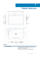 Feature 18. Docking pins Allows docking to the keyboard dock. 19. Docking slots (2) Allows docking to the keyboard dock. 20. Service Tag label Provides the Service Tag and Express Service Code needed for contacting Dell. 21. NFC-sensor area (Latitude 5179 only) Allows NFC-enabled devices to communicate with your tablet. 22. Rear camera Allows you to video chat, capture photos, and record videos. 23. Security-cable slot Connects a security cable to prevent unauthorized movement of your tablet.