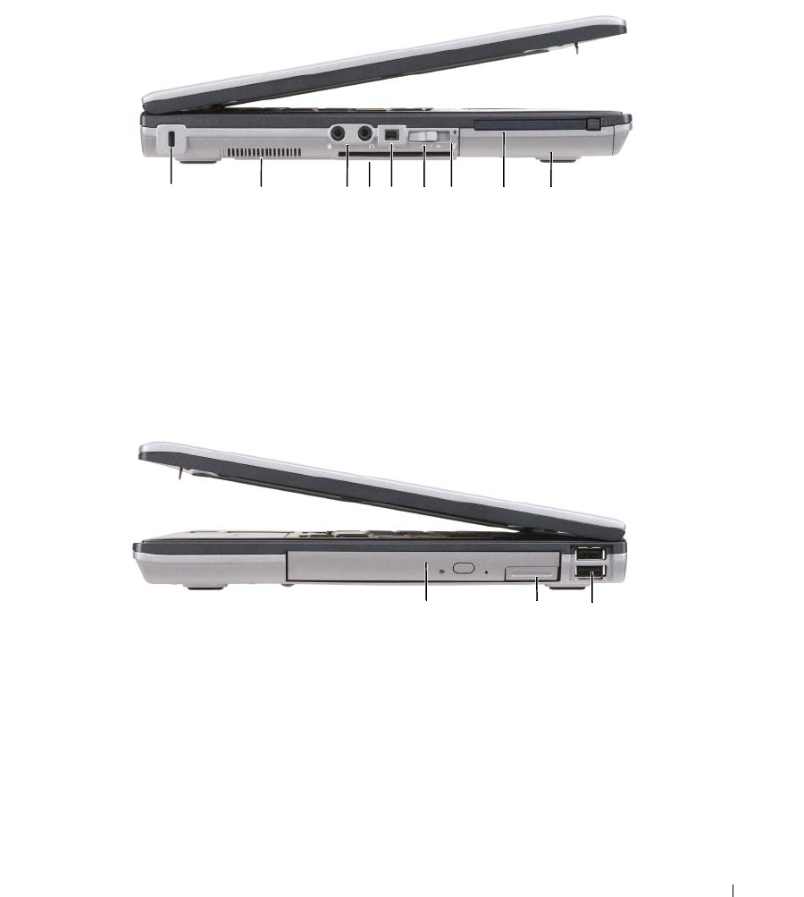 1 Optisk enhet i mediefacket 2 Mediefackets frigöringsspak 3 USB-portar (2)