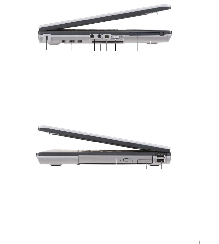 1 optisk drev i mediebåsen 2 udløserpal til mediebås-enhed 3 USB-stik (2)