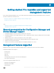 2 Getting started: Pre-requisites and supported management features Before using Configuration Manager, be sure to meet all pre-requisites and understand the supported management features for Dell Wyse thin clients contained in the following sections: • General Pre-requisites for Configuration Manager and Device Manager Support • Management Features Supported Topics: • General pre-requisites for Configuration Manager and Device Manager support • Management features supported General pre-requisites f