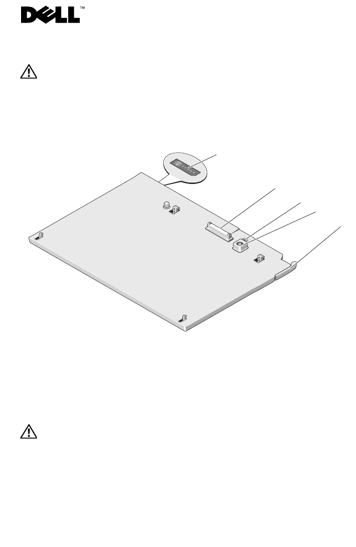 Информация о предупреждениях ВНИМАНИЕ! — указывает на потенциальную опасность повреждения оборудования, получения легких травм или угрозу для жизни. Плоский аккумулятор функции 1 2 3 4 5 1 индикатор состояния аккумулятора 2 разъем для стыковки 3 индикатор источника питания 4 разъем адаптера переменного тока 5 рычажок фиксатора Ноябрь 2008 г.
