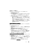 両方のコンポーネントのインストール ConfigMgr 用 DLCI を Site Server または 管理コンソールにインストールす るには、次の手順を実行します。 1 Custom Setup(カスタムセットアップ)画面から、Dell Lifecycle Controller Utility および Dell Provisioning Server オプション の 両方を選択して、Next(次へ)をクリックします。 両方のオプションを示すカスタムセットアップ設定の確認画面が表示 されます。 2 Next(次へ)をクリックします。 Dell Provisioning Service User Credentials for ConfigMgr Access(ConfigMgr アクセス用 Dell Provisioning Service ユーザー資 格情報)画面が表示されます。 3 次のいずれかの手順を実行します。 – サイトサーバー上で、Dell Provisioning サービスが ConfigMgr にア クセスするために使用する(必要な権限のある)アカウントを、新しく 検出された iDR