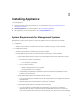 Installing Appliance 3 To install appliance: 1. Check and review system requirements, for more information see System Requirements for Management Systems. 2. Download appliance, for more information, see Downloading Appliance. 3. Set up appliance, for more information, see Setting up Appliance. System Requirements for Management Systems Management systems are the systems on which the appliance and its components are installed.