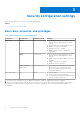 3 Security configuration settings This section provides an overview of user accounts and privileges. Topics: • User roles, accounts, and privileges User roles, accounts, and privileges Table 1. Metro node user accounts and privileges Component Account Type Default password Privileges Metro node service - ● Access to the metro node management server desktop, VPlexcli, and Unisphere for metro node UI. ● Run permissions for VPlexcli related scripts. ● Ability to run VPlexcli commands.