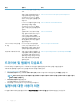 작업 설명서 위치 Controller 사용 설명서를 참조하십 시오. 파트너 프로그램 엔터프라이즈 시 Dell.com/omconnectionsenterprisesystemsmanagement 스템 관리에 대한 자세한 내용은 OpenManage Connections 엔터프 라이즈 시스템 관리 설명서를 참조 하십시오. Connections 및 클라이언트 시스템 Dell.com/dellclientcommandsuitemanuals 관리에 대한 자세한 내용은 OpenManage Connections 클라이 언트 시스템 관리 설명서를 참조하 십시오. 인벤토리 보기, 구성 및 모니터링 Dell.com/esmmanuals 작업, 원격으로 서버 켜기 또는 끄 기 및 Dell 섀시 관리 컨트롤러 (CMC)를 사용하여 서버와 구성 요 소에 대한 알림을 활성화하는 방법 에 대한 정보는 CMC 사용 설명서 를 참조하십시오.