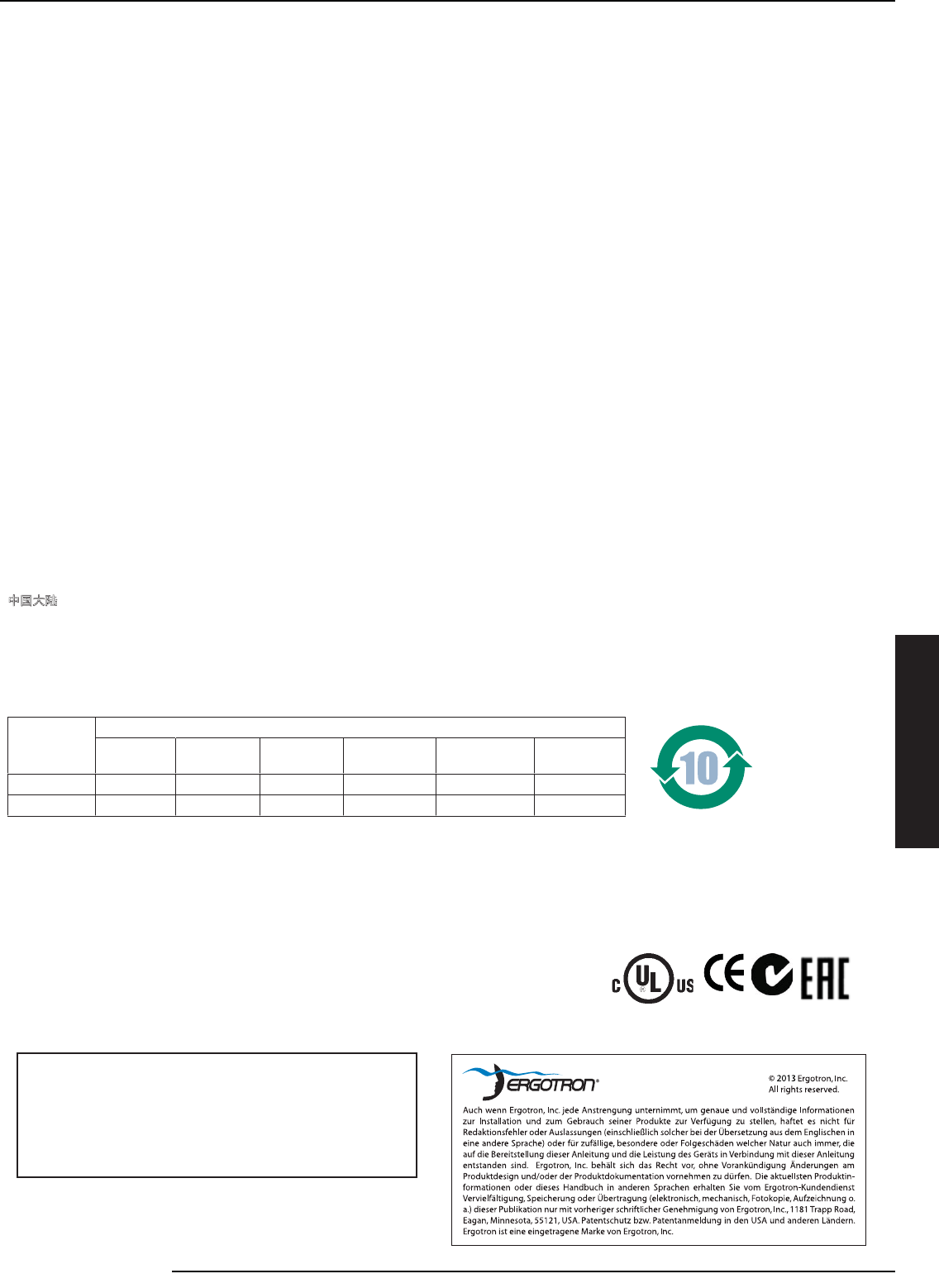 FCC-Vorsichtshinweis: Von Ergotron nicht ausdrücklich genehmigte Veränderungen können dem Benutzer die Befugnis zum Betreiben der Ausrüstung entziehen.
