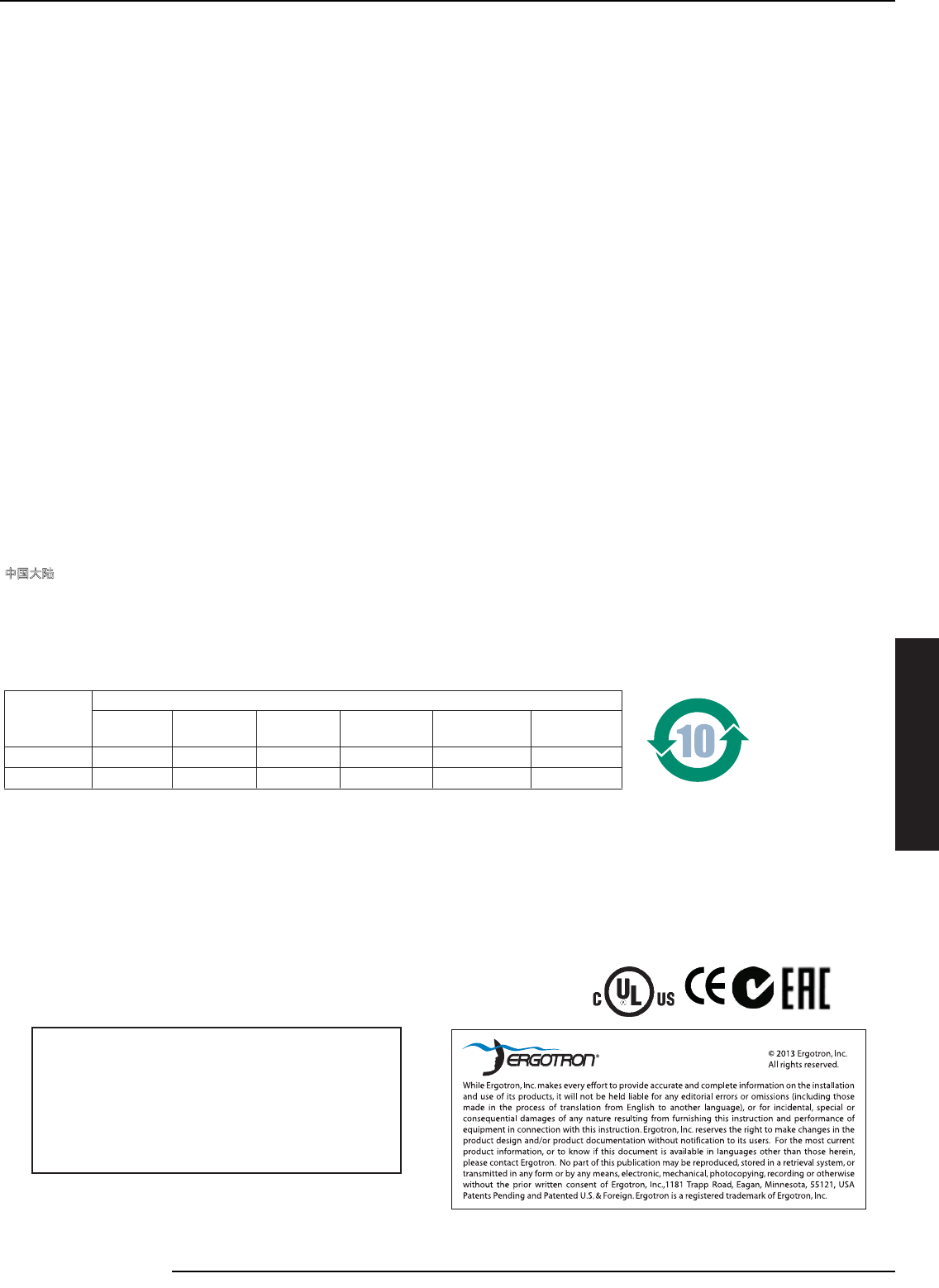 Cuidado FCC: alterações ou modifi cações não aprovadas expressamente pela Ergotron podem cancelar a autoridade do usuário de operar o equipamento.