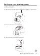 Setting up your wireless mouse Installing the battery 1. Locate the slot on the side of the mouse cover. Using your fingertip, pry open the cover. 2. Remove the USB dongle from its compartment. 3. Install the AA battery into the battery compartment.