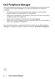 Dell Peripheral Manager Le logiciel Dell Peripheral Manager vous permet d'effectuer les opérations suivantes : Attribuer des raccourcis de programme aux boutons ou aux touches programmables du périphérique via l'onglet Action. Afficher les informations du périphérique, telles que la version du firmware et l'état de la pile via l'onglet Info. Mettre à jour la version du firmware de vos périphériques. Appairer des autres périphériques avec le dongle USB RF ou directement avec votre ordinateur via Bluetooth.