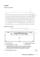 Tastatur Ansicht von oben Ansicht von unten 1 Ein-/Ausschalter 4 Batteriefachabdeckung 2 Verbindungsmodus-Leuchten 5 PPID-Etikett • Weiße LED blinkt: Gerät ist nicht mit Computer verbunden • Weiße LED leuchtet: Gerät ist mit Computer verbunden • Bernsteinfarbene LED blinkt: Batteriestand ist gering 3 Verbindungsmodus-Taste Funktionen und Merkmale │ 7