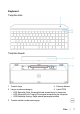 Keyboard Tampilan atas Tampilan bawah 1 Tombol daya 4 Penutup baterai 2 Lampu mode sambungan 5 Label PPID • LED Berkedip Putih: Perangkat tidak tersambung ke komputer • LED Menyala Putih Terang: Perangkat tersambung ke komputer • LED Berkedip Kuning: Daya baterai perangkat rendah 3 Tombol sakelar mode sambungan Fitur │ 7