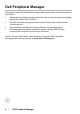Dell Peripheral Manager Perangkat lunak Dell Peripheral Manager dapat digunakan untuk menjalankan hal berikut: Menetapkan pintasan program ke tombol atau kunci perangkat yang dapat diprogram melalui tab Tindakan. Melihat informasi perangkat seperti versi firmware dan status baterai melalui tab Info. Meningkatkan pembaruan firmware terbaru di perangkat Anda. Memasangkan perangkat tambahan melalui dongle USB RFatau langsung ke komputer Anda melalui Bluetooth.