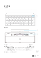 キーボード 上面図 底面図 1 電源スイッチ 4 電池カバー 2 接続モードライト 5 PPID ラベル • LED が白に点滅:デバイスがコンピュータに接続されていない • LED が白に点灯:デバイスがコンピュータに接続されている • LED が黄色に点滅:デバイスのバッテリー残量が少ない 3 接続モード切り替えボタン 特徴 │ 7