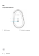 Osobine Miš Pogled s gornje strane 1 2 3 4 5 Levi taster Desni taster Točkić za pomeranje Taster za napred Taster za nazad 6 Indikatori režima povezivanja • Beli LED indikator treperi: Uređaj nije povezan s računarom • Beli LED indikator neprekidno sija: Uređaj je povezan s računarom • Tamnožuti LED indikator treperi: Nizak nivo napunjenosti baterije u uređaju 7 Taster za režim povezivanja 8 Oznaka PPID Osobine │ 5