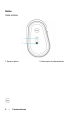 Características Ratón Vista superior 1 Botón izquierdo 2 Botón derecho 3 Rueda de desplazamiento 4 Botón delantero 5 Botón trasero 6 Luces de Modo Conexión • Parpadeo LED en blanco: El dispositivo no está conectado al PC • Iluminación LED en blanco fijo: El dispositivo está conectado al PC • Parpadeo LED en ámbar: La batería del dispositivo está baja 7 Botón de Modo de Conexión 8 Etiqueta PPID Características │ 5