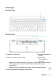 Клавіатура Вигляд згори Вигляд знизу 1 Перемикач живлення 4 Кришка батарейного відсіку 2 Лампочки режиму підключення 5 Ярлик PPID (Ідентифікатор процесу) • Мерехтить білий світлодіод: Пристрій не підключено до комп'ютера • Світлодіод постійно горить білим: Пристрій підключено до комп'ютера • Мерехтить бурштиновий світлодіод: Низький заряд батарей 3 Кнопка перемикання режиму підключення Функції │ 7