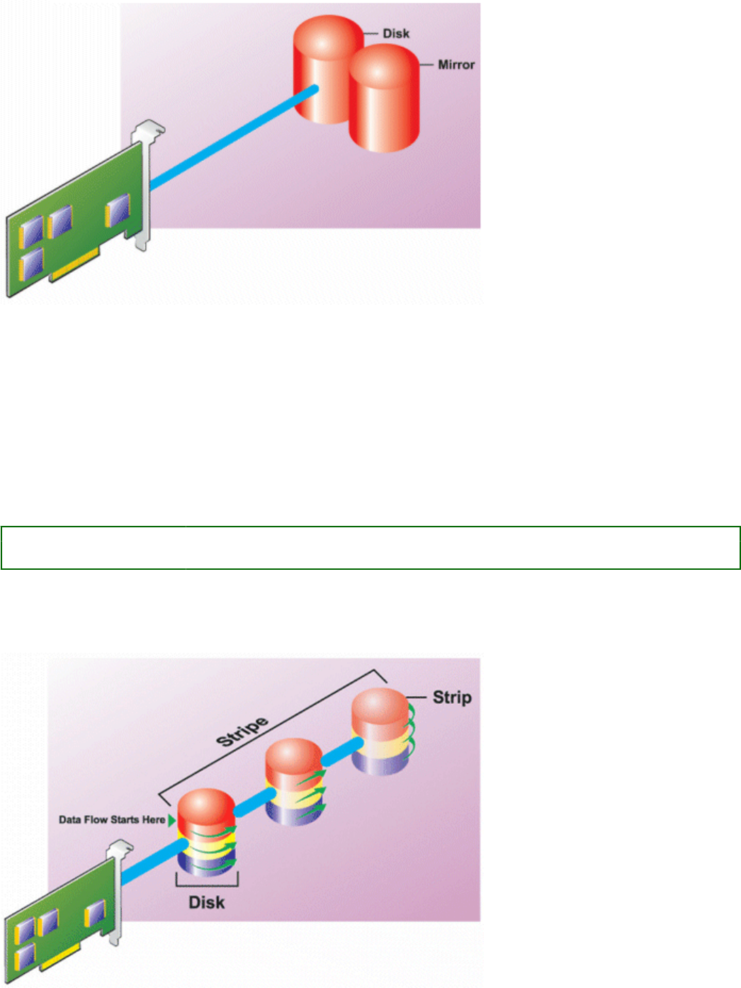 ● いずれかのディスクで障害が起きても、仮想ディスクの動作は中断されません。データは、故障したディスクのミラーから読