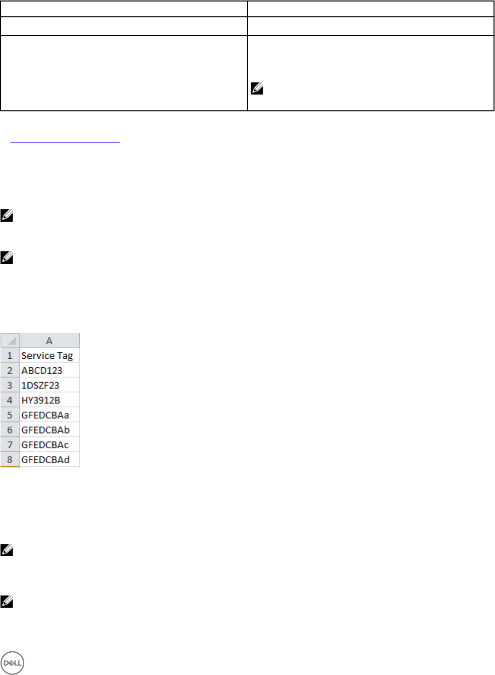 • Must be listed in the .csv file in a column titled ‘ServiceTag’, ‘Service Tag’, or ‘Node ID’.