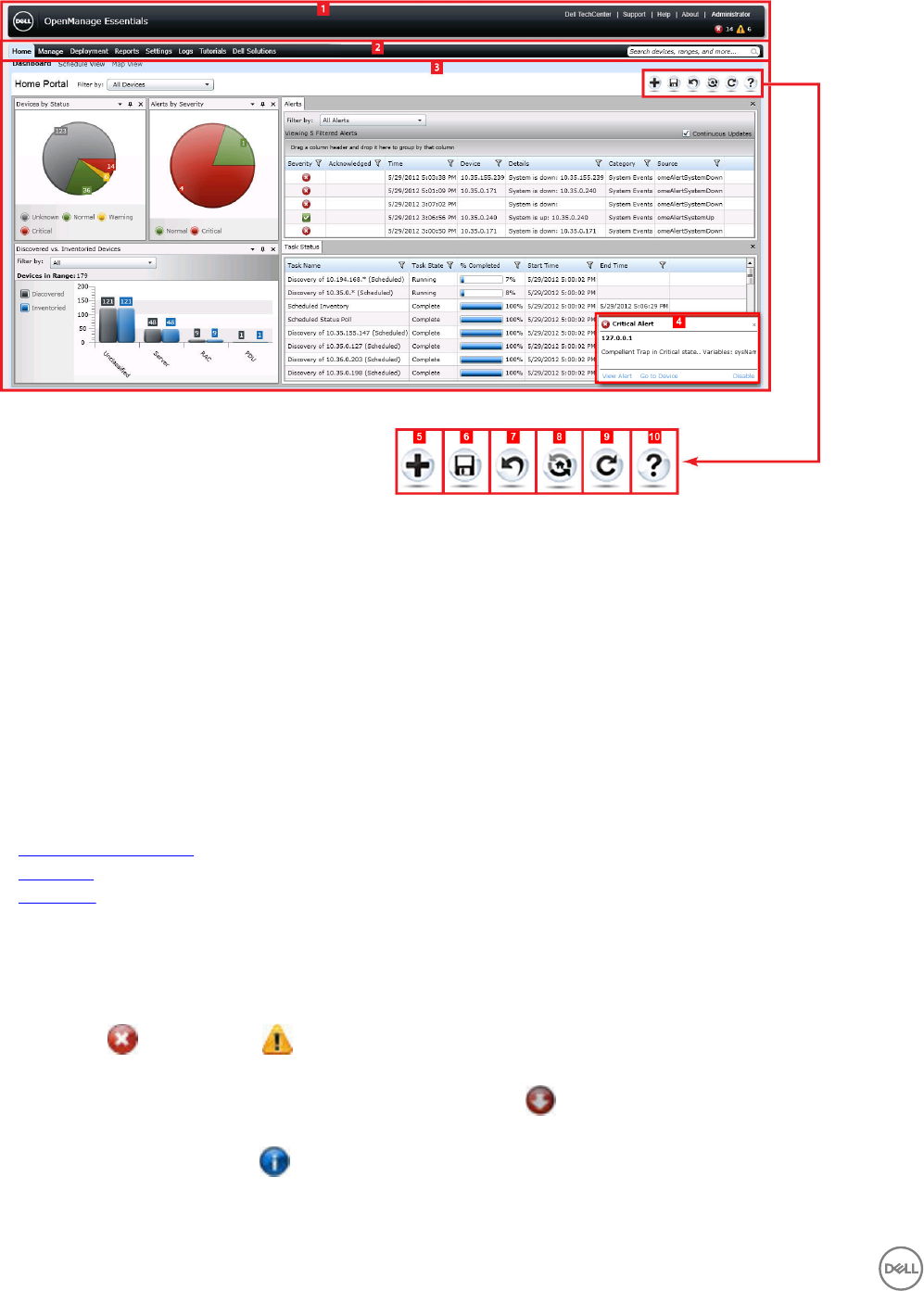 • Update available notification icon indicates if a newer version of OpenManage Essentials is available. Click the icon to open