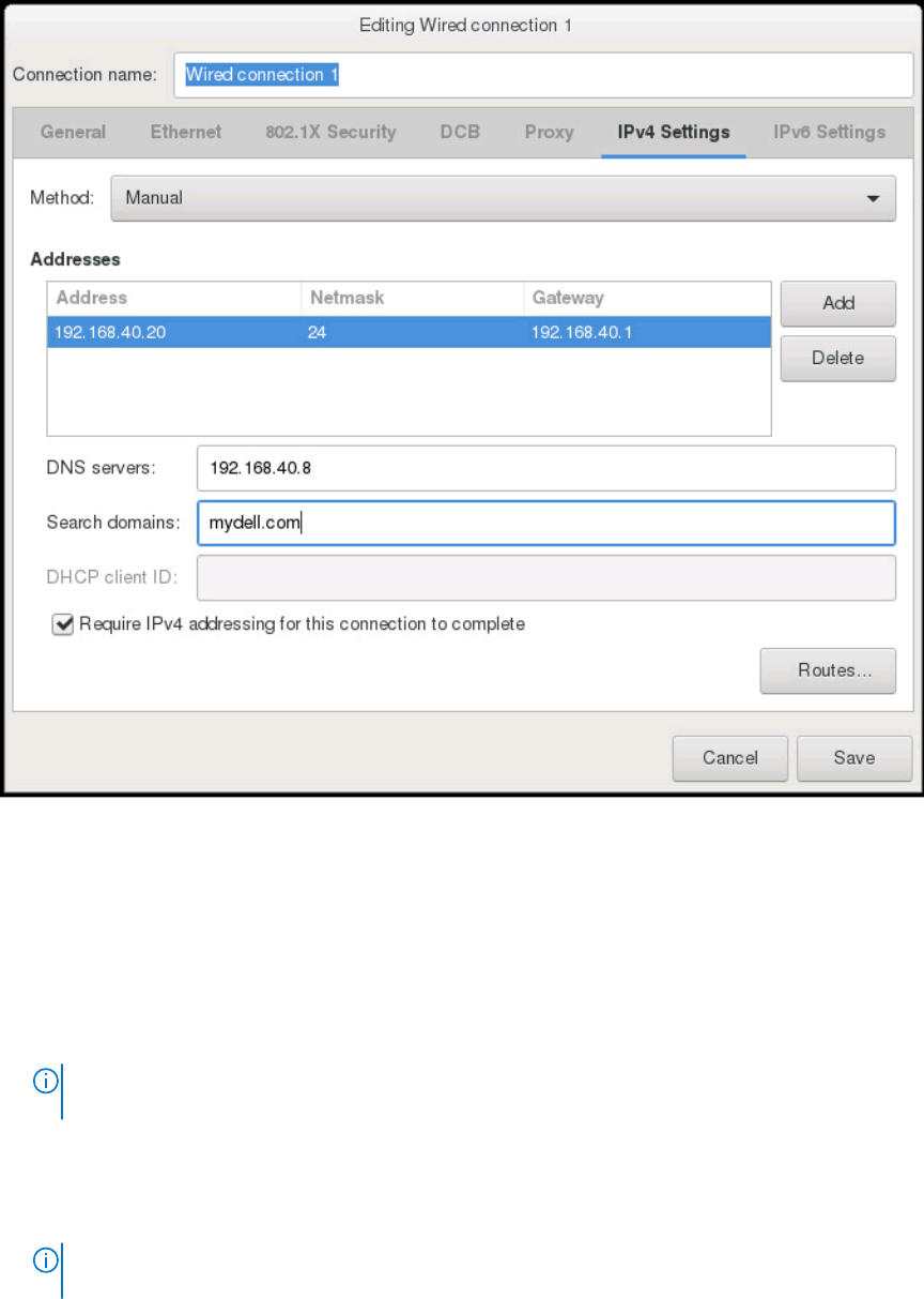 c. Enter the DNS server IP and domains to be searched for in the DNS Servers and Search Domains boxes respectively.