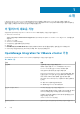 표 14. 단일 호스트에 대한 하드웨어 세부 정보 (계속) 하드웨어: 구성 요소 정보 메모리 ● 메모리 슬롯 - 사용된 메모리 개수, 총 메모리 개수 및 사용 가 능한 메모리 개수를 표시합니다. ● 메모리 용량 - 설치된 메모리, 총 메모리 용량 및 사용 가능한 메모리를 표시합니다. ● 슬롯 - DIMM 슬롯을 표시합니다. ● 크기 - 메모리 크기를 표시합니다. ● 유형 - 메모리 유형을 표시합니다. NIC ● 총 - 사용 가능한 네트워크 인터페이스 카드의 총 개수를 표 시합니다. ● 이름 - NIC 이름을 표시합니다. ● 제조업체 - 제조업체 이름만 표시합니다. ● MAC 주소 — NIC MAC 주소를 표시합니다. PCI 슬롯 ● PCI 슬롯 - 사용된 슬롯, 총 슬롯 및 사용 가능한 PCI 슬롯을 표시합니다. ● 슬롯 - 슬롯을 표시합니다. ● 제조업체 - PCI 슬롯의 제조업체 이름을 표시합니다. ● 설명 - PCI 장치에 대한 설명을 표시합니다.