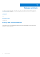 1 Release summary The OMIVV 5.0 release provides HTML-5 Client support, new vSphere version support, dual network adapter support, MX chassis firmware update, enhancement in the system profile, deployment, and cluster profile flow. For more information, see New and enhanced features on page 6. Version 5.0 Release date September 2019 Priority and recommendations Recommended: Dell EMC recommends applying this update during your next scheduled update cycle.
