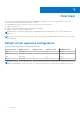 Table 10. Supported features on modular infrastructure Features M1000e VRTX FX2s MX Multi-chassis management group relationship information N N N Y Firmware Update N N N Y Storage space required for provisioned storage The OMIVV virtual appliance requires at least 95 GB of disk space for provisioned storage. Default virtual appliance configuration The OMIVV virtual appliance is provisioned with 8 GB of RAM and two virtual CPU (Small Deployment Mode).