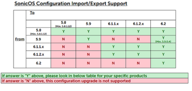 - The following matrix illustrates the supported source and destination versions of SonicOS when importing configuration settings from one appliance to another