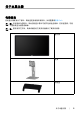 关于本显示器 包装物品 您的显示器配有以下部件。请检查是否收到所有部件,如有遗漏请联系 Dell。 注:某些物品为选配件,因此您的显示器中可能不包括这些物品。在某些国家,可能 不提供某些功能或者媒体。 注:要安装其它支架,请参阅相应的支架安装指南以了解安装说明。 显示器 支架 电缆盖 关于本显示器 | 5