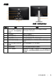 产品特定问题 特定症状 屏幕图像过小 遇到的问题 图像在屏幕正中,但 没有填满整个显示区 无法使用前面板的 屏幕上不显示 OSD 按钮调整显示器 可采取的解决方案 • 在显示的 OSD 菜单中检查宽高比设置。 • 将显示器复位至出厂设置。 • 关闭显示器,拔下并重新插回电源电缆,然后打开显 示器。 • 检查 OSD 菜单是否被锁定。若是,按住电源按钮旁边的 按钮 10 秒钟解锁 (参见闭锁)。 按下用户控制按钮 没有画面,LED 灯显 • 检查信号源。移动鼠标或者按键盘上的任意键,确定计算 示白色 机不在省电模式中。 时显示没有输入 信号 • 检查信号电缆是否已经正确插入。如果必要可重新连接信 号电缆。 • 重启计算机或者视频播放机。 图像没有填满整个 图像无法达到屏幕的 屏幕 最大高度或者宽度 • 由于 DVD 使用不同的视频格式 (宽高比),显示器可全 屏显示。 • 运行内置诊断功能。 注:在选择 HDMI/DP 模式时,自动调节功能不可用。 通用串行总线 (USB) 特定问题 特定症状 USB 接口不工作 遇到的问题 USB 外围设备不 工作 可采取的解决方案 • • • • • •