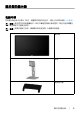 關於您的顯示器 包裝內容 您的顯示器包裝中包含以下元件。請確認您收到所有元件,如缺少任何物品請與 Dell 聯絡。 注意:某些物件可能為選購配件,因此不會隨您的顯示器而提供。某些功能或媒體在 某些國家中可能無法使用。 注意:若要安裝其它支架,請參閱支架安裝指南,以瞭解安裝說明。 顯示器 支架 連接線外蓋 關於您的顯示器 | 5