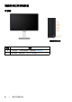 背視圖 含顯示器支架的背視圖 標籤 說明 使用 1 VESA 安裝孔 (100 mm x 100 mm - 於安裝的外蓋 後方) 採用 VESA 相容的壁掛安裝套件安裝顯示器 (100 mm x 100 mm)。 2 法規標籤 列出通過的法規。 3 支架移除按鈕 可從顯示器鬆開支架。 4 安全鎖槽 使用安全鎖固定顯示器 (安全鎖未包括在內)。 5 條碼序號標籤 若要聯絡 Dell 以取得技術支援,請參考標籤上的 資訊。 6 Dell Soundbar 安裝托架 插槽 用以連接選購的 Dell Soundbar。 7 連接線整理槽 可將連接線穿過此整理槽以整理連接線。 8 USB 下載埠 連接您的 USB 裝置。只有在將 USB 連接線連接到 電腦且 USB 上載連接器連接到顯示器之後才可使用 該連接器。 關於您的顯示器 | 9